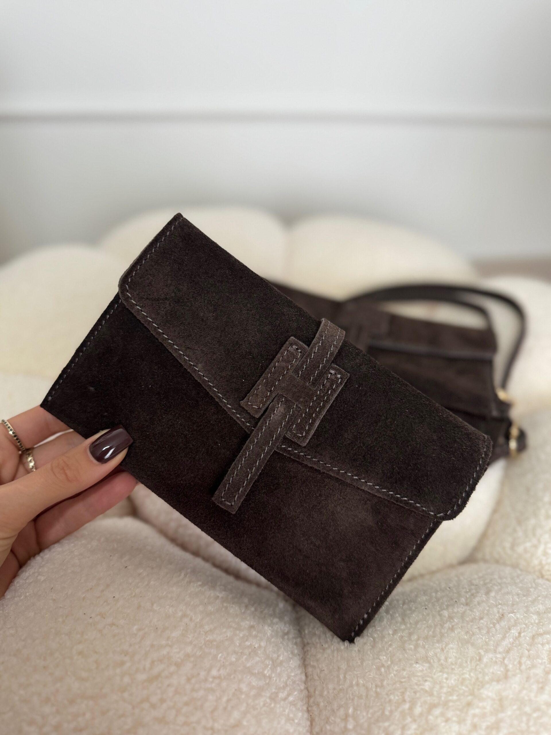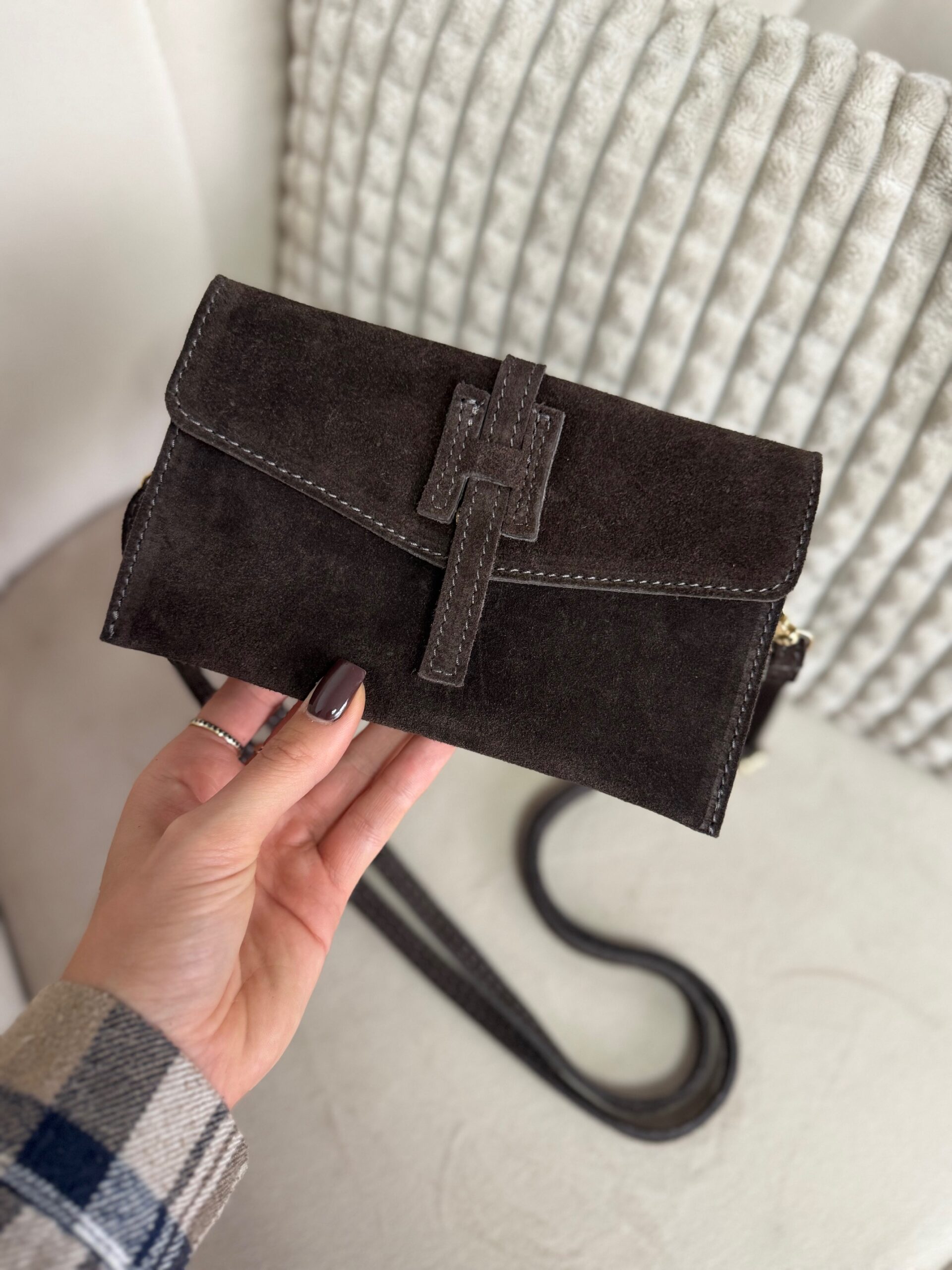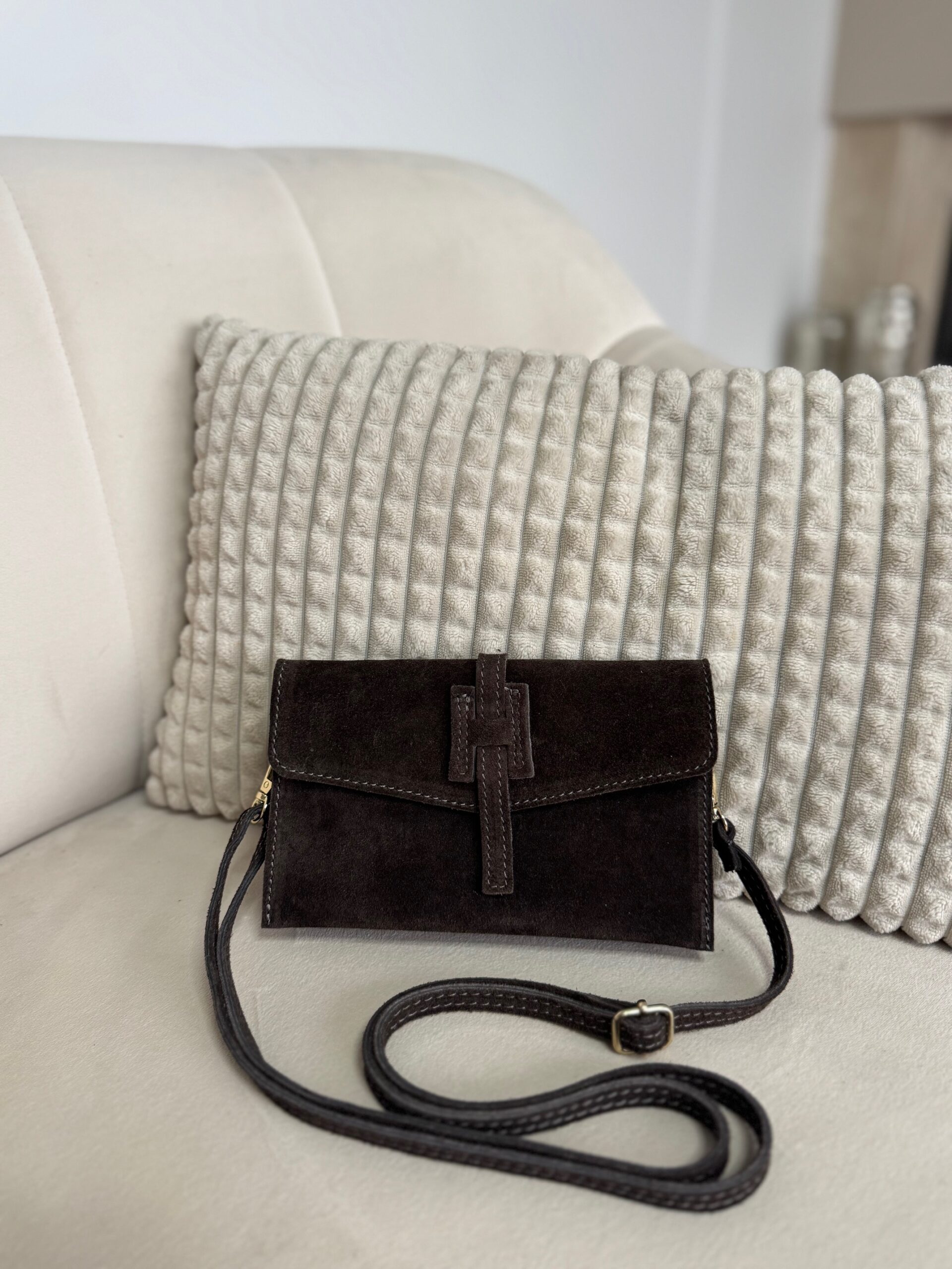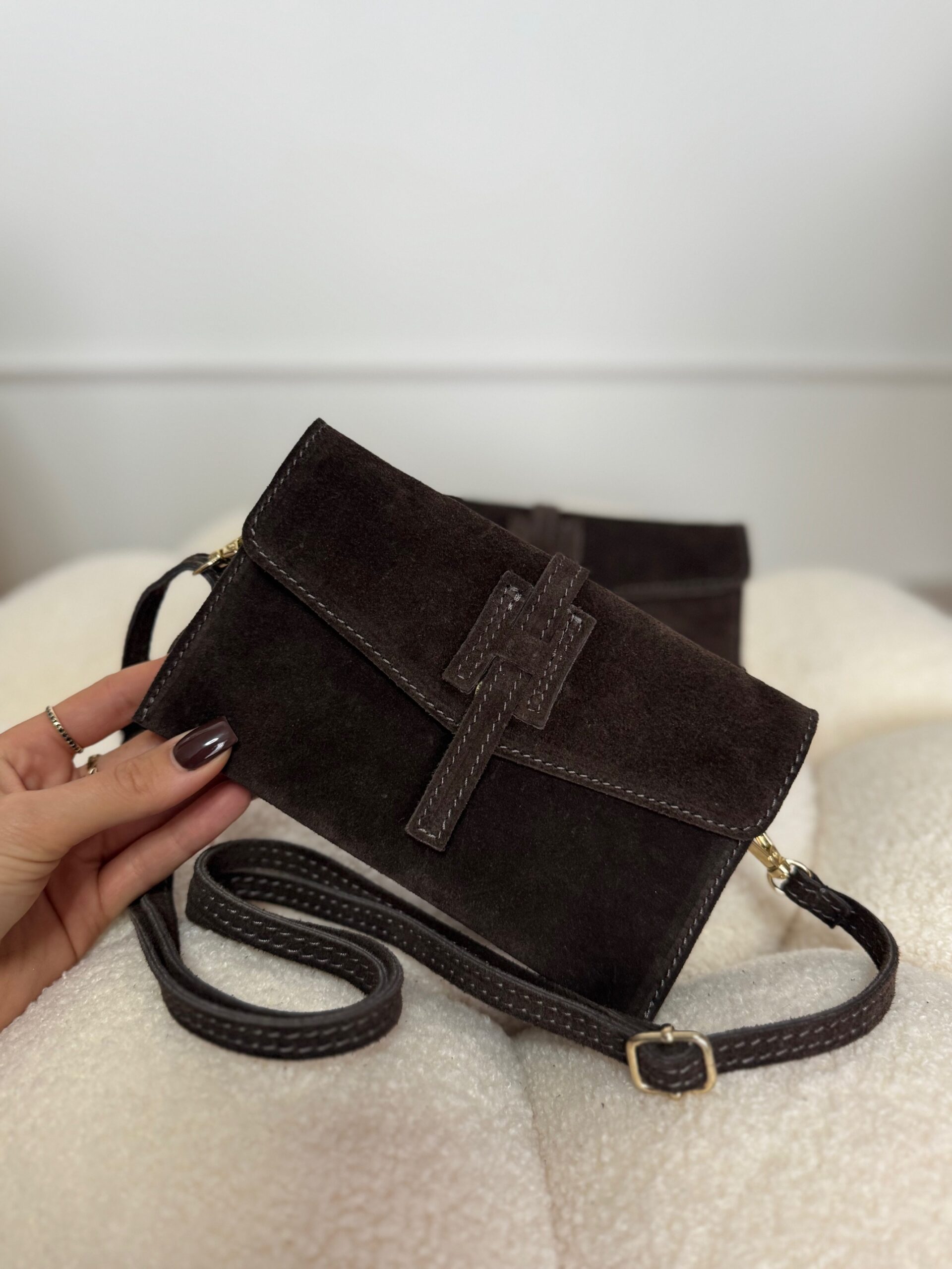 Zapinana na dekoracyjne zamszowe zapięcie, przyciąga uwagę subtelnym, ale wyjątkowym wykończeniem. W środku znajdziesz trzy przegródki – na telefon, klucze i drobiazgi.
